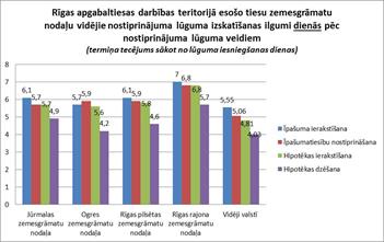 Datu avots: Tiesu administrācija (Valsts vienotās datorizētās zemesgrāmatas pārzinis) Jāatzīmē, ka 2014.gadad uzņēmumu aptaujas par administratīvo procedūru ietekmi uz uzņēmējdarbības vidi Latvijā rezultāti liecina, ka kopumā samazinājušās uzņēmēju laiks uz īpašumtiesību un citu tiesību, apgrūtinājumu reģistrāciju Zemesgrāmatā – ja 2011.gada dati liecina, ka process vidēji aizņēma 30 dienas, tad 2014.gadā – 24.dienas. Tomēr vērojams pieaugums vidējais procedūru nokārtošanai patērēto dienu skaits ir pieaudzis paziņojuma saņemšanai par pašvaldības atteikšanos no pirmpirkuma tiesībām - lai gan 45% respondentu paziņojuma saņemšana no pašvaldības prasīja 1-7 dienas, vidēji aptaujas respondentiem šai procedūrai nācās patērēt 24 dienas (16 dienas 2011. gadā). Turpinot reformas nekustamā īpašuma reģistrācijā Zemesgrāmatā, par pamatu izmantojot pasaules valstīs pastāvošo labo praksi, Latvija varētu turpināt progresu šajā jomā. Plānotās aktivitātes Jānodrošina praksē elektronisku nekustamā īpašuma reģistrēšanu. Lai ieviestu mūsdienu uzņēmējdarbības prasībām atbilstošus un efektīvus valsts pārvaldes pakalpojumus Latvijā, kā arī vērtējot starptautisko labo praksi nekustamā īpašumtiesību reģistrācijā, nepieciešams turpināt Zemesgrāmatu nodaļu pakalpojumu pieejamību Latvijā un ieviest elektronisku nekustamā īpašuma tiesību nostiprināšanas reģistrāciju. Šobrīd, lai reģistrētu nekustamā īpašumu, uzņēmējs kārto visas nepieciešamās formalitātes papīrā, tostarp apmeklējot Zemesgrāmatu nodaļas klātienē. Nepieciešams nodrošināt praksē elektroniskās reģistrācijas formas izmantošanu, kas paredz nekustamā īpašumtiesību reģistrācijas nostiprināšanu Zemesgrāmatā, nodrošināt e-paraksta iespēju, kā arī nodrošināt, ka elektroniski tiek iesaistītas visas iesaistītās institūcijas nekustamā īpašuma tiesību nostiprināšanai Zemesgrāmatā. Minētā pasākuma ieviešana ir atkarīga no iepriekš minētā likumprojekta "Grozījumi Zemesgrāmatu likumā" virzības Saeimā. Jāpaplašina no pašvaldības elektroniski saņemamās informācijas apjoms, t.i., informācija par atteikšanos no pirmpirkuma tiesībām. Eiropas Reģionālā attīstības fonda projekta "Tieslietu ministrijas un tās padotībā esošo iestāžu arhīvu sagatavošana elektronisko pakalpojumu sniegšanai - 1.kārta" ietvaros jau apzinātas nekustamā īpašuma ierakstīšanas un tiesību nostiprināšanas procesā iesaistītās institūcijas, t.sk., to elektroniska iesaiste. Iepriekš minētie Saeimā esošie likumprojekti (Grozījumi Zemesgrāmatu likumā", "Grozījumi Nekustamā īpašuma valsts kadastra likumā" un "Grozījumi likumā "Par nekustamā īpašuma ierakstīšanu zemesgrāmatā"") būtiski palielina sadarbības apjomu tiesību nostiprināšanas procesā gan VZD un zemesgrāmatu nodaļām, kā arī starp zemesgrāmatu nodaļām (lēmumu pieņemšanas procesā tiks izmantoti citā zemesgrāmatu nodaļā iesniegti un ieskenēti dokumenti), kā arī paredz zvērinātam notāram pienākumu iesniegt nostiprinājuma lūgumu. Ievērojot minēto, ar attiecīgu grozījumu spēkā stāšanās, uzdevums tiks izpildīts, ciktāl tas neskar pašvaldību iesaisti. Nepieciešams nodrošināt, ka elektroniski tiek paplašināts no pašvaldības saņemamās informācijas apjoms, t.i., informācija par atteikšanos no pirmpirkuma tiesībām. Lai to īstenotu nepieciešams veikt grozījumus likumā "Par zemes reformu Latvijas Republikas pilsētās", likumā "Par zemes reformu lauku apvidos" un MK 2010 gada 28.septembra noteikumos Nr.919 "Par vietējo pašvaldību pirmpirkuma tiesību izmantošanas kārtību un termiņiem", nodrošinot, ka elektroniski tiek paplašināts no pašvaldības saņemamās informācijas, t.i., informācijas par atteikšanos no pirmpirkuma tiesībām, apjoms" nodrošinot, ka elektroniski tiek paplašināts no pašvaldības saņemamās informācijas, t.i., informācijas par atteikšanos no pirmpirkuma tiesībām, apjoms. Norādāms, ka šobrīd minēto normatīvo esošā redakcija rada juridisku šķērsli praktiski īstenot jau šobrīd normatīvajos regulējumos paredzēto kārtību, ka iestādes saskaņā ar Valsts pārvaldes iekārtas likuma 54.panta sestajā daļā noteikto sadarbojoties nepieciešamo informāciju sniedz elektroniskā veidā, ja ārējā normatīvajā aktā nav noteikts citādi). • Ieviešot pilnīgi elektronisku nekustamā īpašuma reģistrāciju, uzņēmējiem tiktu būtiski atvieglota procedūras kārtošana, samazinot esošo 18 dienu skaitu līdz minimumam, tādējādi nodrošinot vienas pieturas aģentūras principu, atbilstoši Doing Business metodoloģiskajiem apsvērumiem, kā arī ļautu Latviju ierindot šajā jomā 9.vietā (no 33.vietas) un ceļot kopējo reitingu par 4 vietām (no 24.vietas uz 21.vietu) Doing Business 2014.gada rādītājos pie citiem nemainīgiem rādītājiem. Jānosaka zvērinātam notāram pienākumu iesniegt nostiprinājuma lūgumu, ja tā pamatā ir notariāls akts. Šobrīd nekustamā īpašuma reģistrēšanai nepieciešams notariāls apliecinājums pirkuma līguma gadījumā – šāda procedūra Doing Business 2014 izdalīta atsevišķi un pēc būtības satur slogu uzņēmējam, apmeklējot vairākas iestādes nekustamā īpašuma reģistrēšanai. Lai uzlabotu informācijas apriti un tās ātrumu TM ir izstrādāti grozījumi Zemesgrāmatu likumā, kas paredz zvērinātam notāram pienākumu iesniegt elektroniski nostiprinājuma lūgumu un tam pievienotos dokumentus zemesgrāmatu nodaļā, tādējādi atvieglojot uzņēmējam saistošās prasības. Šobrīd norit likumprojekta saskaņošana. Pasākuma izpildes tieši ietekmē un atstās pozitīvu ietekmi uz Doing Business rādītāju, jo notariāli apliecināta pirkuma līguma gadījumā (šāda procedūra izdalīta atsevišķi)