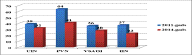 Datu avots: 2014.gada Uzņēmumu aptauja par administratīvo procedūru ietekmi uz uzņēmējdarbības vidi. Vērtējot uzņēmējdarbības vieglumu, aptauja identificē tādu problēmjomu pastāvēšanu kā uzņēmējdarbības uzsākšana, nodokļi un komercstrīdu risināšana. Lai rastu risinājumu, EM 2014.gada maijā tika organizētas ekspertu diskusijas un apzinātas rekomendācijas nepieciešamajiem pasākumiem uzņēmējdarbības vides pilnveidošanai, atbilstoši uzņēmēju šodienas vajadzībām. Tika piesaistīti eksperti gan no valsts pārvaldes, gan – privātā sektora. Rezultātā tika sagatavots ziņojums par administratīvo procedūru ietekmi uz uzņēmējdarbības vidi Latvijā ar pasākumiem turpmākai rīcībai. Minētie pasākumi iekļauti Plānā 2014.-2015.gadam. Norādāms, ka problēmas, kas saistītas ar attiecīgo jomu politiku ir risināma valdības deklarācijas un nozaru ministriju kompetenču ietvaros, Plānā 2014-2015.gadam netiek risināti šādi pasākumi. 5. Uzņēmējdarbības vides uzlabošanas pasākumi 2014.-2015.gadam Plāna 2014.-2015.gada ietvaros ir izvirzīti pasākumi, lai risinātu uzņēmēju identificētās problēmas, ņemot vērā 2013.-2014.gadā veiktās uzņēmumu aptaujas rezultātus par administratīvo procedūru ietekmi uz uzņēmējdarbības vidi Latvijā, kā arī iekļauti pasākumi, kas uzlabotu Latvijas pozīcijas Pasaules Bankas pētījumā Doing Business, un, ievērojot savstarpējo korelāciju starp starptautiskajiem reitingiem, attiecīgi ietekmētu arī GKI un Ekonomiskās brīvības rādītājus, tādējādi nodrošinot Latvijas uzņēmējdarbības vides uzlabošanas pasākumu ietekmes vērtējumu starptautiskajā līmenī. Tāpat Plānā 2014.-2015.gadam tiek turpināti pasākumi, kas iekļauti Pānā 2013.-2014.gadam. Jānorāda, ka visu izvirzīto uzlabošanas pasākumu ietekmes vērtējums modelēts uz Doing Business 2014.gada rādītājiem, pieņemot, ka pārējās valstīs reformas netiek veiktas.