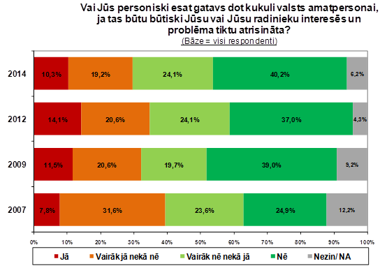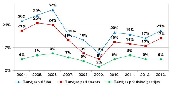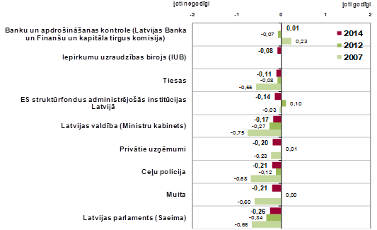 1 Eiropas Reģionālās attīstības fonds, Eiropas Sociālais fonds, Kohēzijas fonds, Eiropas Lauksaimniecības fonds lauku attīstībai un Eiropas Jūrlietu un zivsaimniecības fonds 2 Eiropas Ekonomikas zonas finanšu instruments, Norvēģijas finanšu instruments (turpmāk – EEZ/Norvēģijas finanšu instrumenti) un Latvijas un Šveices sadarbības programma (turpmāk – Šveices programma) 3 Eiropas Parlamenta un Padomes Regulas (ES) Nr. 1303/2013 ar ko paredz kopīgus noteikumus par Eiropas Reģionālās attīstības fondu, Eiropas Sociālo fondu, Kohēzijas fondu, Eiropas Lauksaimniecības fondu lauku attīstībai un Eiropas Jūrlietu un zivsaimniecības fondu un vispārīgus noteikumus par Eiropas Reģionālās attīstības fondu, Eiropas Sociālo fondu, Kohēzijas fondu un Eiropas Jūrlietu un zivsaimniecības fondu un atceļ Padomes Regulu (EK) Nr. 1083/2006 125.panta 4.punkta c) apakšpunkts; Eiropas Parlamenta un Padomes Regulas (ES) Nr. 1306/2013 par kopējās lauksaimniecības politikas finansēšanu, pārvaldību un uzraudzību un Padomes Regulu (EEK) Nr. 352/78, (EK) Nr. 165/94, (EK) Nr. 2799/98, (EK) Nr. 814/2000, (EK) Nr. 1290/2005 un (EK) Nr. 485/2008 atcelšanu 58.panta 1. un 2.punkts; Eiropas Parlamenta un Padomes 2012.gada 25.oktobra regula (ES, EURATOM) Nr. 966/2012 par finanšu noteikumiem, ko piemēro Savienības vispārējam budžetam, un par Padomes Regulas (EK, Euratom) Nr. 1605/2002 atcelšanu; Article 114.1 d) of COM(2011) 804 of 2.12.2011; Eiropas Parlamenta un Padomes Regulas (ES) Nr. 223/2014 (2014.gada 11.marts) par Eiropas atbalsta fondu vistrūcīgākajām personām 32.panta 4.punkta c) apakšpunkts; Komisijas īstenošanas regulas (ES) Nr. 897/2014 (2014.gada 18.augusts), ar ko paredz īpašus noteikumus to pārrobežu sadarbības programmu īstenošanai, kuras finansē saskaņā ar Eiropas Parlamenta un Padomes Regulu (ES) Nr. 232/2014, ar ko izveido Eiropas kaimiņattiecību instrumentu 26.panta 5.punkta (c) apakšpunkts; Eiropas Parlamenta un Padomes Regulas (ES) Nr. 514/2014 (2014. gada 16. aprīlis), ar ko paredz vispārīgus noteikumus Patvēruma, migrācijas un integrācijas fondam un finansiālā atbalsta instrumentam policijas sadarbībai, noziedzības novēršanai un apkarošanai un krīžu pārvarēšanai 5.pants, 21.panta h) apakšpunkts. 4 Norvēģijas Ārlietu ministrija un Eiropas Ekonomikas zonas finanšu instrumenta komiteja. 5 Eiropas Ekonomikas zonas finanšu instrumenta komitejas 2011.gada 13.janvārī apstiprinātie noteikumi par Eiropas Ekonomikas zonas finanšu instrumenta ieviešanu 2009.–2014.gadā un Norvēģijas Ārlietu ministrijas 2011.gada 11.februārī apstiprinātie noteikumi par Norvēģijas finanšu instrumenta ieviešanu 2009.-2014.gadā. 6 Latvijas Republikas valdības un Šveices Konfederācijas padomes 2007.gada 20.decembrī noslēgtais Ietvarlīgums par Latvijas un Šveices sadarbības programmas īstenošanu. 7 Informatīvais ziņojums "Korupcijas novēršanas un apkarošanas programmas 2009.–2013.gadam īstenošana" http://www.knab.gov.lv/lv/legislations/policy_planning/strategy/ 8 Informatīvais ziņojums "Par Korupcijas novēršanas un apkarošanas pamatnostādņu 2009.-2013.gadam un programmas īstenošanu" http://www.knab.gov.lv/uploads/free/knabzino_17032014_programma_2009.-20131.pdf 9 Likums attiecas uz tādu kapitālsabiedrību valdes un padomes locekļiem, kurā vienas vai vairāku valsts vai pašvaldības kapitālsabiedrību daļa pamatkapitālā kopumā vai atsevišķi pārsniedz 50 procentus 10 The 2014 EU Justice Scoreboard, 8.lpp., http://ec.europa.eu/justice/effective-justice/files/justice_scoreboard_2014_en.pdf. 11 TIS informācija par lietu izskatīšanas vidējo svērto ilgumu 1.instancē un apelācijas instancē (mēnešos) 2014.gada pirmais pusgads. 12 TIS informācija par lietu izskatīšanas vidējo svērto ilgumu kasācijas instancē (mēnešos) 2014.gada pirmais pusgads. 13 Standard Eurobarometer 80. http://ec.europa.eu/public_opinion/archives/eb/eb80/eb80_first_en.pdf 14 Globalais korupcijas barometrs, 2013.gada ziņojums. http://www.transparency.org/policy_research/surveys_indices/gcb/2010/results 15 Special Eurobarometer 397 http://ec.europa.eu/public_opinion/archives/eb_special_399_380_en.htm#397, 63.lpp. 16 Komisijas paziņojums Eiropas Parlamentam, Padomei un Ekonomikas un sociālo lietu komitejai "Korupcijas apkarošana Eiropas Savienībā" COM(2011) 308 galīgā redakcija 17 http://www.europarl.europa.eu/oeil/popups/ficheprocedure.do?lang=en&reference=2013/2107%28INI%29 18 Biedrība "Sabiedrības par atklātību – Delna". 2011.gada Valstiskā godaprāta sistēmas novērtējums Latvijā, 23.lpp. 19 http://www.em.gov.lv/images/modules/items/tsdep/makro_situac_valsti/EMZino_22_151013.pdf 20 http://www.csb.gov.lv/statistikas-temas/iedzivotaju-ienemumi-galvenie-raditaji-30268.html 21 Iekšlietu ministrijas informācija: http://www.iem.gov.lv/lat/aktualitates/informacija_medijiem/?doc=28102 22 Eurostat, http://epp.eurostat.ec.europa.eu/tgm/table.do?tab=table&language=en&pcode=tessi190 Džini koeficients variē no 0 līdz 100. Džini koeficients ir 0, ja pastāv absolūta ienākumu vienlīdzība (t.i., visiem iedzīvotājiem ir vienādi ienākumi), bet, jo vairāk tas tuvojas 100, jo lielāka ir ienākumu nevienlīdzība. 23 Globālās konkurētspējas indekss 2014.-2015. http://www3.weforum.org/docs/ WEF_GlobalCompetitivenessReport_2014-15.pdf 24 Latvijas preču un pakalpojumu eksporta veicināšanas un ārvalstu investīciju piesaistes pamatnostādnes 2013. – 2019.gadam http://polsis.mk.gov.lv/view.do?id=3053 25 Tai skaitā KNAB, IAUI, PVD, VMD, VDI, VID, VI, VRS, VP u.c. 26 2004.-2009.gada periods un 2009.-2014.gada periods 27 Globālais korupcijas barometrs, 2013.gada ziņojums, http://www.transparency.org/policy_research/surveys_indices/gcb/2013/results 28 Special Eurobarometer 397, lauka darbs 2013.gada februāris un marts; http://ec.europa.eu/public_opinion/archives/eb