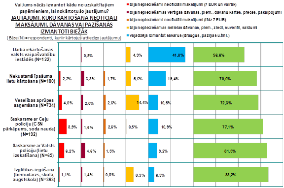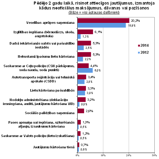 Aptuveni 28% iedzīvotāju no tiem, kas pēdējo divu gadu laikā ir kontaktējušies ar veselības aprūpes jomas speciālistiem un 22%, kontaktējoties ar ceļu satiksmes uzraudzības amatpersonām, 2014.gada aprīlī atzina, ka, saņemot pakalpojumu, ir izmantojuši kādu neoficiālu maksājumu (virs un zem vērtībā septiņiem eiro), devuši dāvanu, izmantojuši pazīšanos vai barterdarījumu. 8,9% atzinuši, ka devuši neoficiālu maksājumu, kas pārsniedz septiņus eiro saskarsmē ar ceļu satiksmes uzraudzības amatpersonām. Visvairāk aptaujāto Latvijas iedzīvotāju (20,2%) pazīšanos, neoficiālus maksājumus vai barterdarījumus izmantojuši ārstēšanās nolūkos (poliklīnikās, slimnīcās), savukārt daudz mazāk – 5 – 6% aptaujas dalībnieku, neoficiālas darbības veikuši saistībā ar izglītības iegūšanu vai darbā iekārtošanos valsts vai pašvaldības iestādē; 4,4% aptaujas dalībnieku neoficiālas darbības veikuši saskarsmē ar ceļa policiju. Citos administratīvās pārvaldes sektoros, kur ir saskare starp pārvaldes amatpersonām un iedzīvotājiem, situatīvās korupcijas izplatība samazinās – tur pretlikumīgus maksājumus izmantojuši 3% un mazāk aptaujāto Latvijas iedzīvotāju. Līdzīgi dati ir atspoguļoti Speciālā Eirobarometra 397 rezultātos, kur no tiem, kas saņēmuši veselības aprūpes pakalpojumus, 7% ir apliecinājuši, ka ir devuši kukuļus, vērtīgu dāvanu vai ziedojumu. 11.attēls. Jomas, saskarsmē ar kurām neoficiāli maksājumi, dāvanas vai pazīšanās ir izmantoti visbiežāk.
