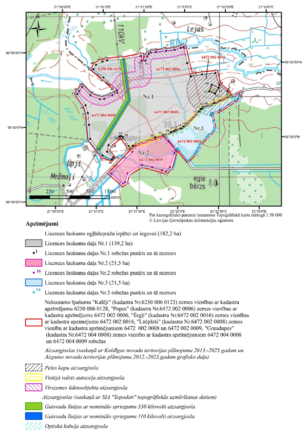 ieguves licences laukumu 182,2 ha platībā (pielikumā), kas
