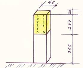 Koka mietiņš (izmēri brīdinājuma zīmei milimetros) ar dzeltenā krāsā nokrāsotu augšējo daļu un aktēšanas datumu.